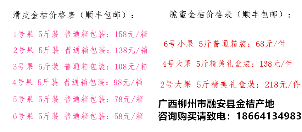 金桔作为融安县传统特产水果,素有“长寿果”的美称。金桔,又名金柑、金枣,不仅清甜爽口,且具有丰富的营养价值。《本草纲目》云:“下气快膈,止渴解酒,辟臭。”中医认为,金桔性温,味辛、甘、酸,入肝、肺、脾、胃经,有化痰止咳,理气消食、疏肝解郁的功效。现代医学研究表明,金桔含有丰富的维生素A,可预防色素沉淀、减缓衰老,可预防癌症,理气止咳、健胃、化痰、预防哮喘及支气管炎;所含的维生素C、维生素P,对防止血管破裂,减少毛细血管脆性和通透性,减缓血管硬化有良好的作用!